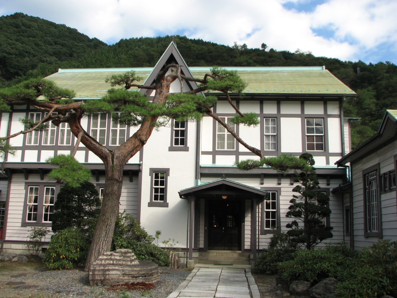 この古河掛水倶楽部は100年ほど前に銅山の迎賓館として建設されました。明治末期には改築されて洋風の二階建てになりました。銅山の宿泊施設や会合に使用されてきたほか、現在も古川機械金属の福利厚生施設として活躍しているのだそうです。