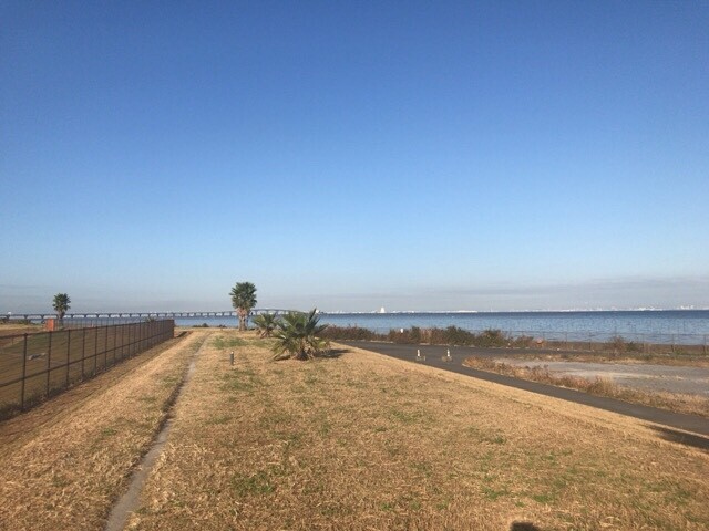 クルマを駐車場に停めた後、公園を時計回りに歩いてみました。海辺に出てみると、空くラインの海ほたるが遠くに見えました。