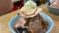 こちらは、焼き旨丼です。どんぶりご飯の上にたくさんの焼肉、温泉玉子、海苔がかかっています。濃いめの味付けなので、ご飯がどんどん進みます。