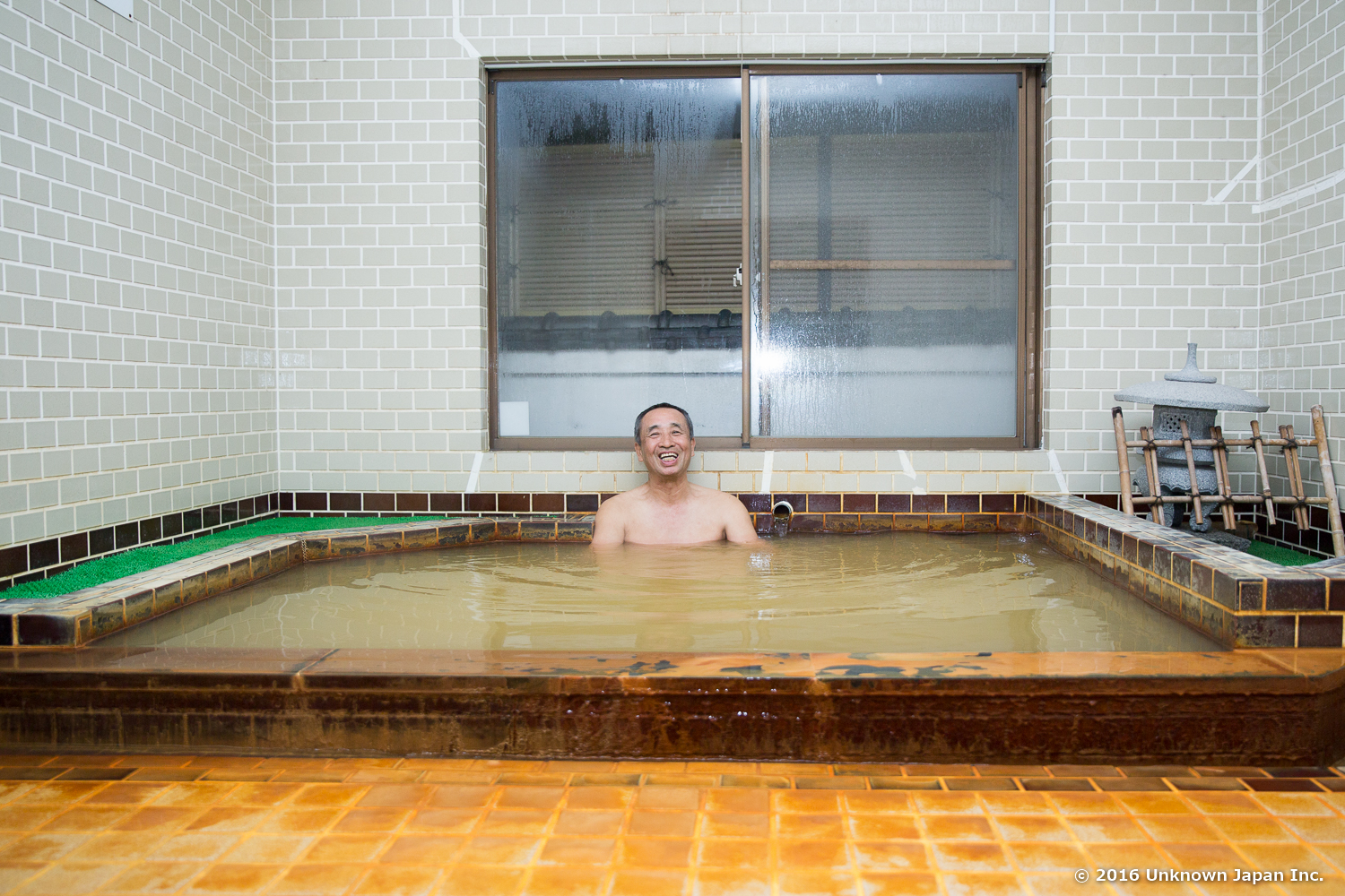 海の近くで濃厚な塩気を感じる温泉です。(写真は温泉とおしゃべりを楽しみに週2、3回いらっしゃるという常連の勝治さん)