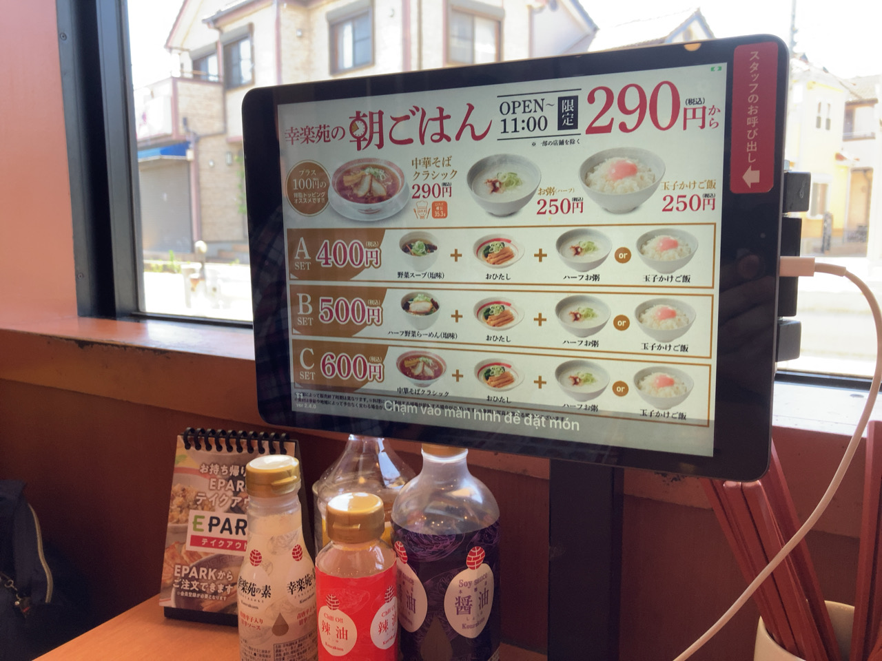 以前来た時に、幸楽苑に新規導入された注文用タブレットがとても使いにくかったので、少しは使いやすく改良されていることを期待していたのですが、前回同様に使いにくいままです。