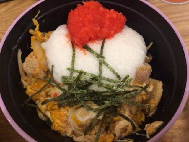 たっぷりの明太子ととろろ、卵でとじられた鶏肉がのっかっている丼です。博多だから明太子だと後から気がつきました。