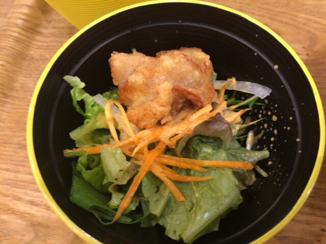 野菜サラダと鳥のから揚げです。鳥の唐揚げはさりげなく、半分になっていました。ちょっとしたところでコストカットされています。