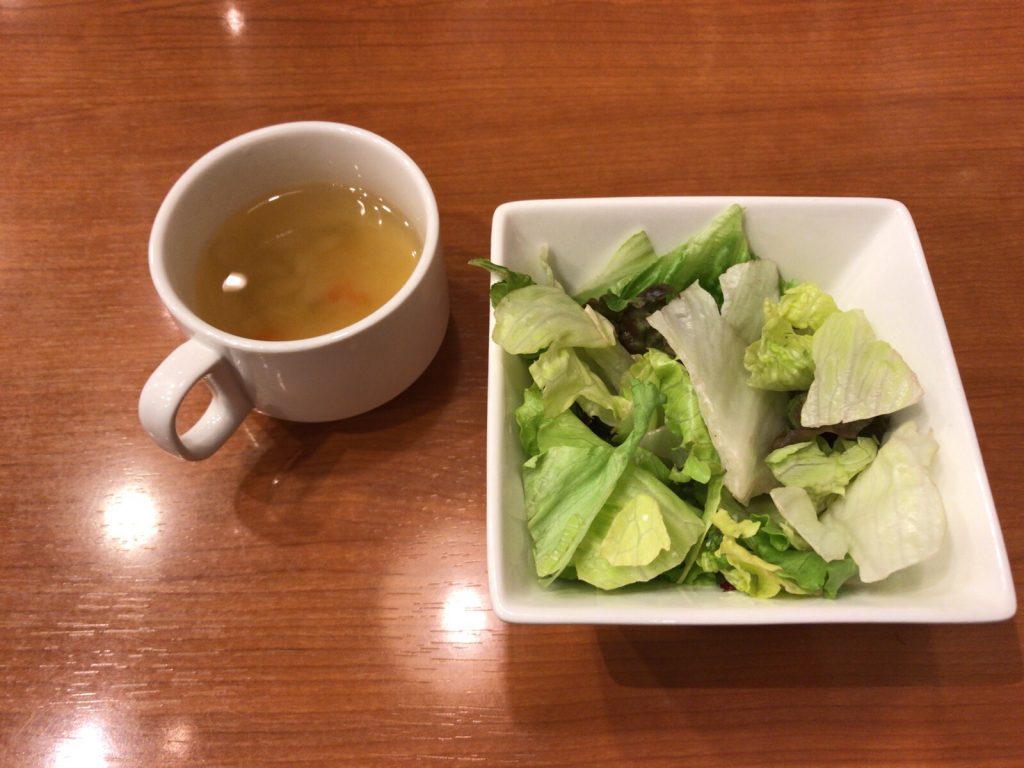 最初にスープとサラダが運ばれてきました。サラダは一回に限りお代わりが自由です。