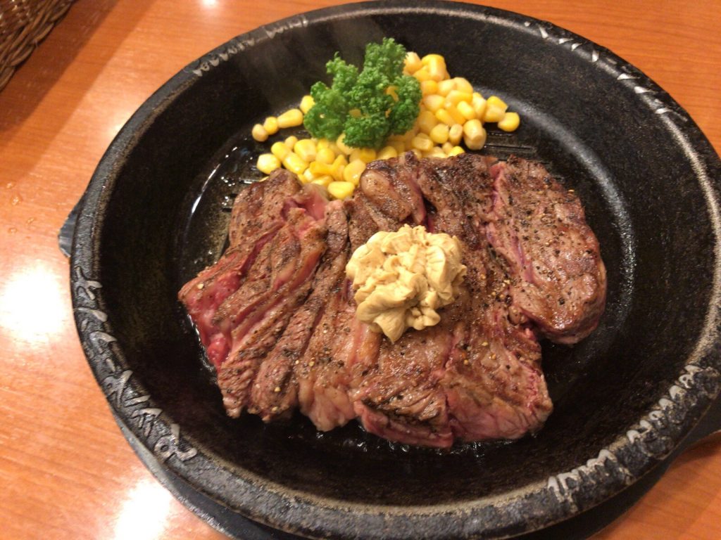 やはり300gのステーキは大きくて厚みもありました。少し筋が多いですが、最初から切れ目を入れてくれているので、比較的食べやすいです。