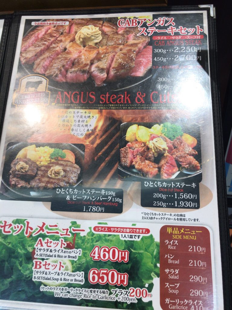 数時間かけて各お店を見て回ったら、万歩計の数字が1万歩を超えてしまいました。お腹も空いたので、今回はアンガスステーキの300gサラダ、パン付きを注文しました。2250円です。