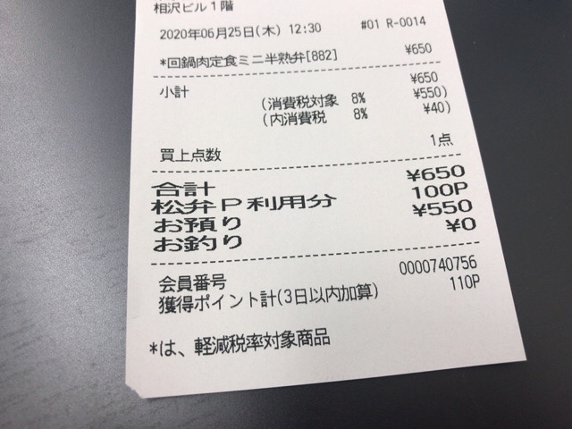 こちらが回鍋肉定食のライスミニです。松弁ネットの初回入会特典の100ポイントを使って、550円になりました。また、今ならば松弁ネットの普及促進キャンペーンで20%分のポイントが還元されますので、実質は110円引の440円です。