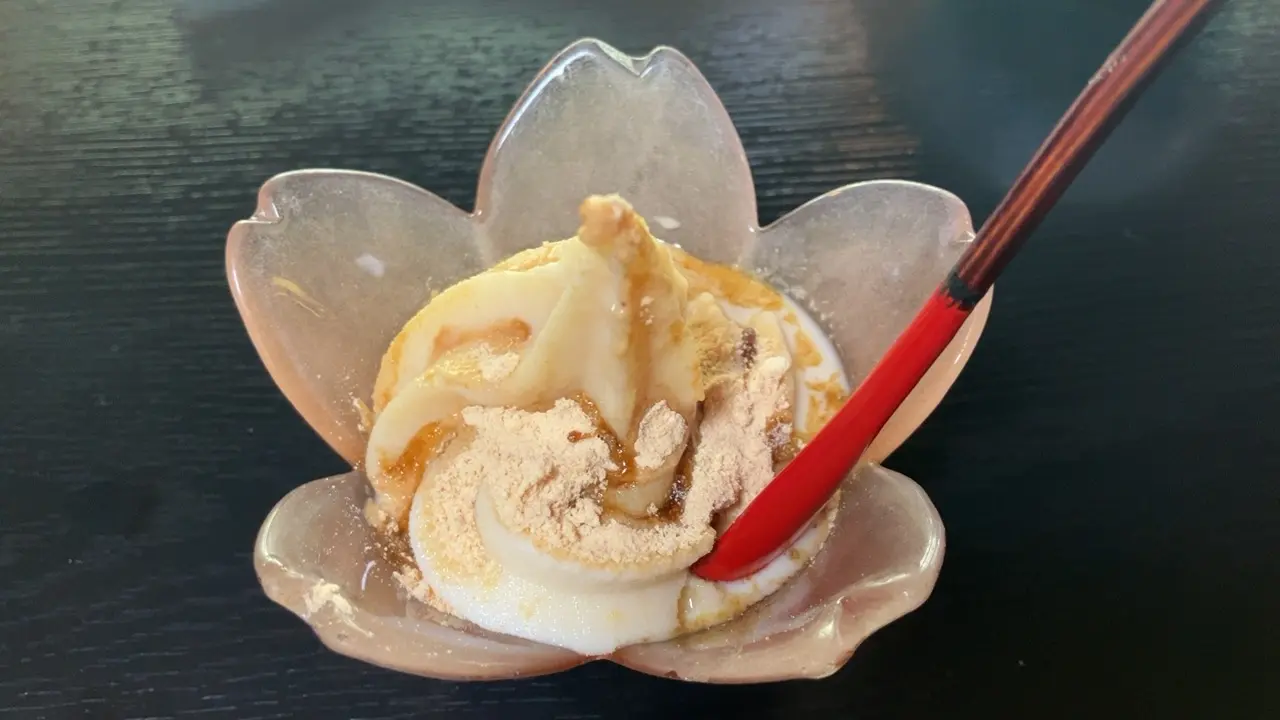 ふたたび、おてらんちをいただいたのですが、デザートはあけぼの大豆のきな粉がかかっているソフトクリームになっていました。信玄餅のような味で美味しいです。
