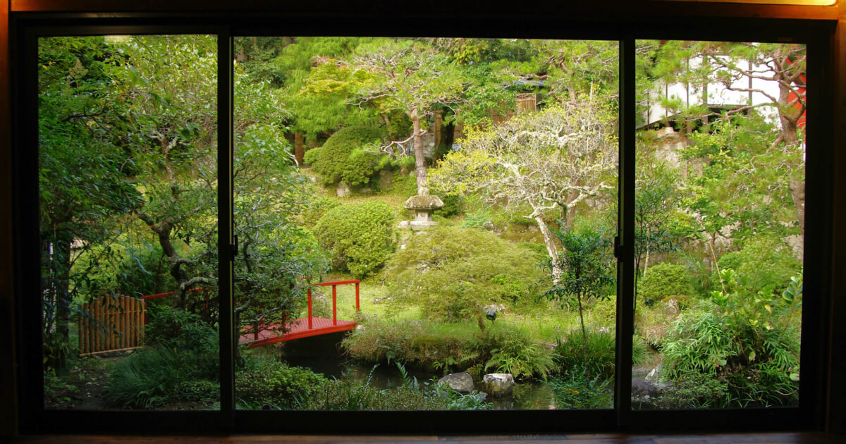 続いて、庭に面した個室に案内してもらいました。こちらが窓から見える庭です。