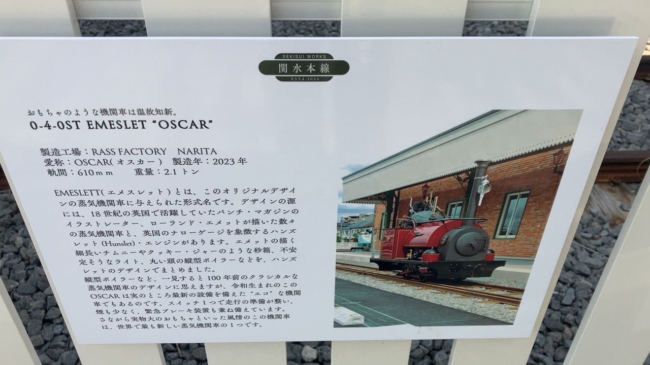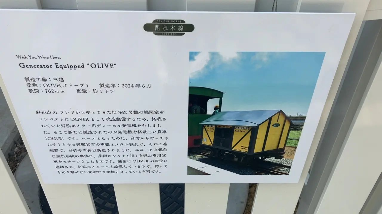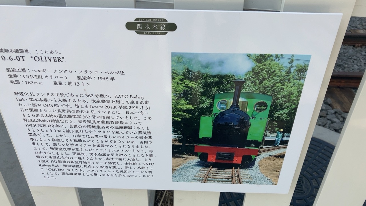 この機関車は1985年まで台湾の台湾糖業公司で仕事をしていましたが、その後、長野県の野辺山SLランドで日本一高いところを走る蒸気機関車362号として活躍しました。当初は台湾で活躍していたときと同様の姿で復元する予定でしたが、日本の安全基準の関係でそれまでのボイラーを修復して使用することが困難なことが判明したため、灯油ボイラーとディーゼル発電機を搭載する改造が行われています。野辺山SLランドが閉園したあとは積水金属に譲渡されました。小型の灯油ボイラーに換装し、後部に電源供給用の小型貨車「OLIVE(オリーブ)」号を連結しています。