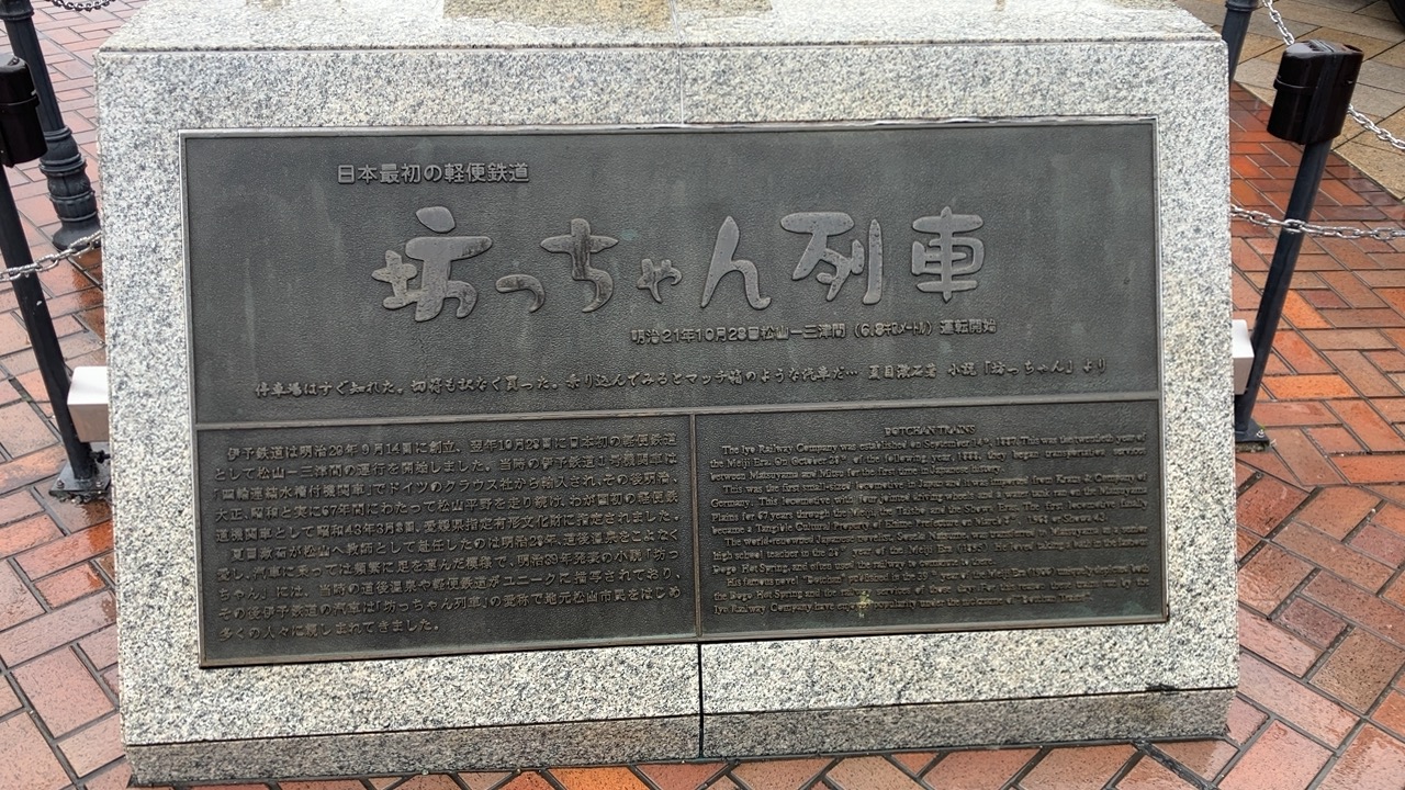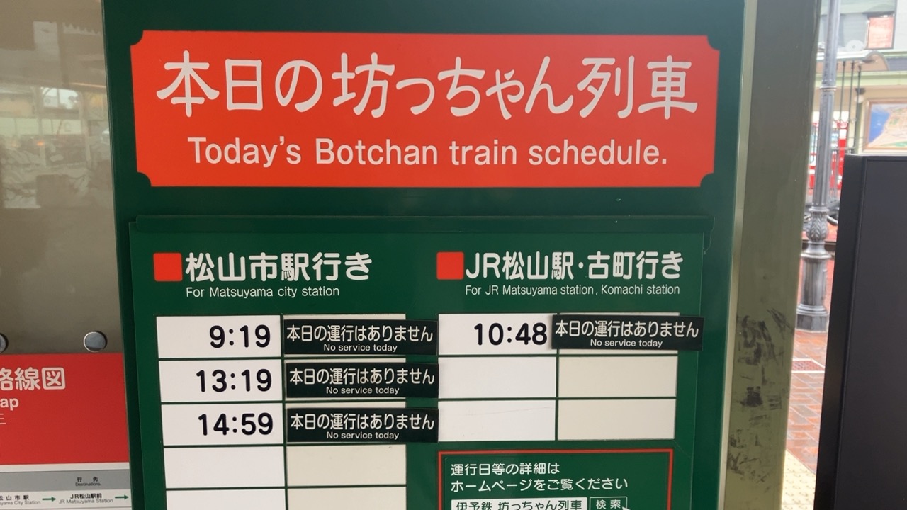 残念ですが、この日は平日だったためか、坊っちゃん列車の運転はありませんでした。運転されていれば、大人1300円、小児650円で乗車することができます。