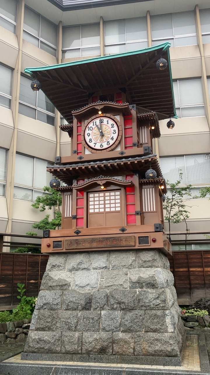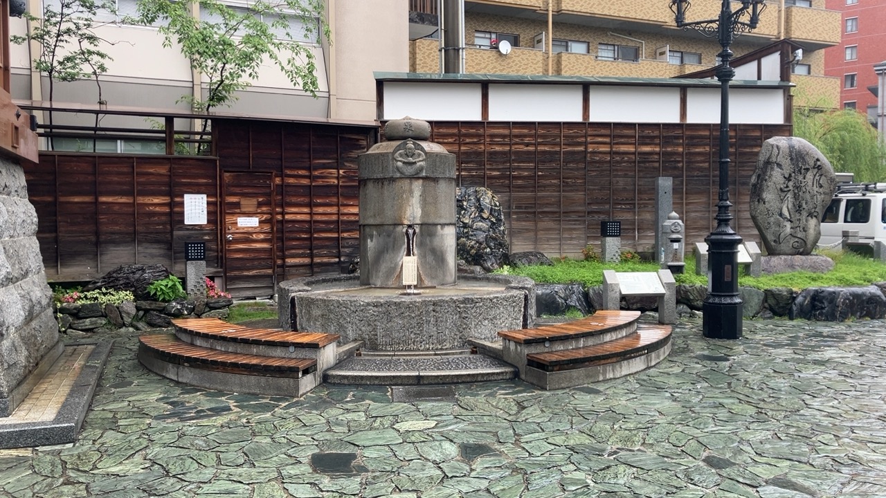 カラクリ時計の横には足湯があります。この足湯は残念ながら屋根がありません。この日は小雨が降っていたので、足湯を利用している人はいませんでした。