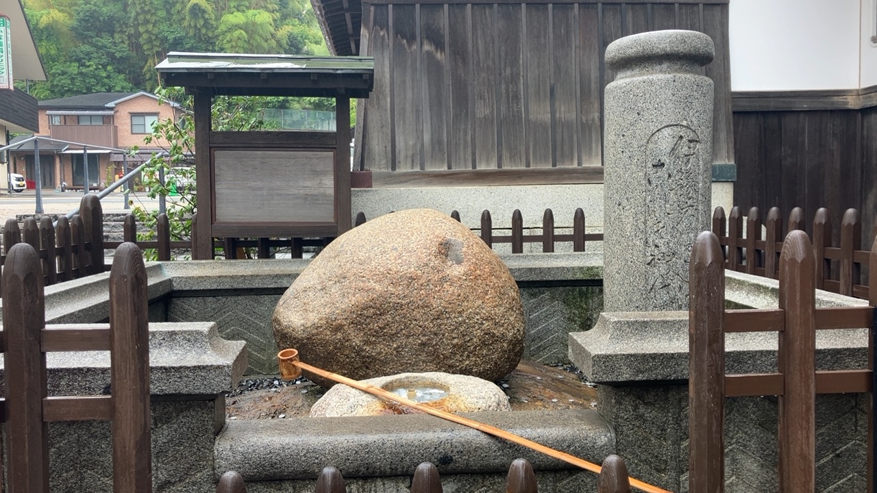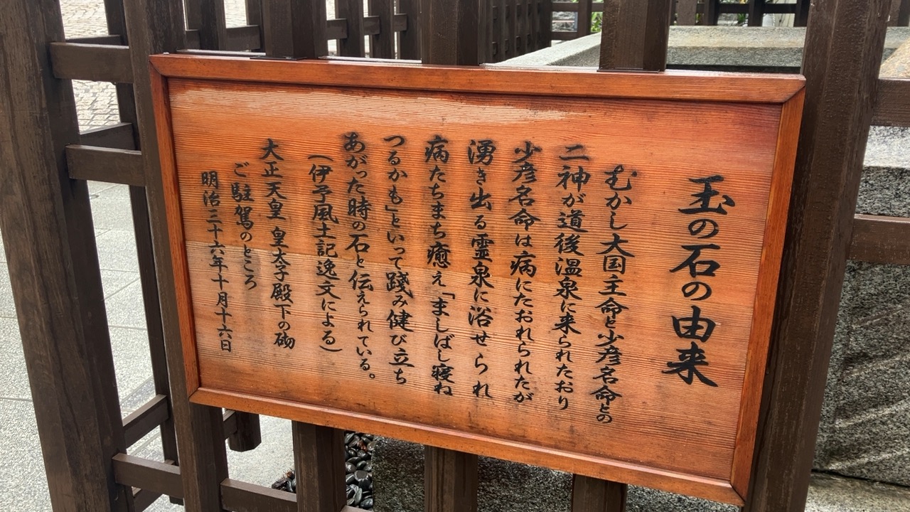 道後温泉本館の向かって左側には、玉の石という少彦名命の足跡が残っていると言われていて、ひしゃくでお湯をかけてお祈りすると願いが叶うと言われています。