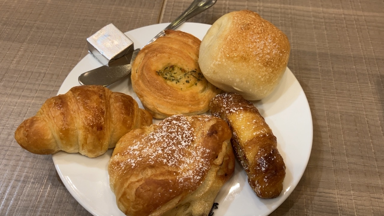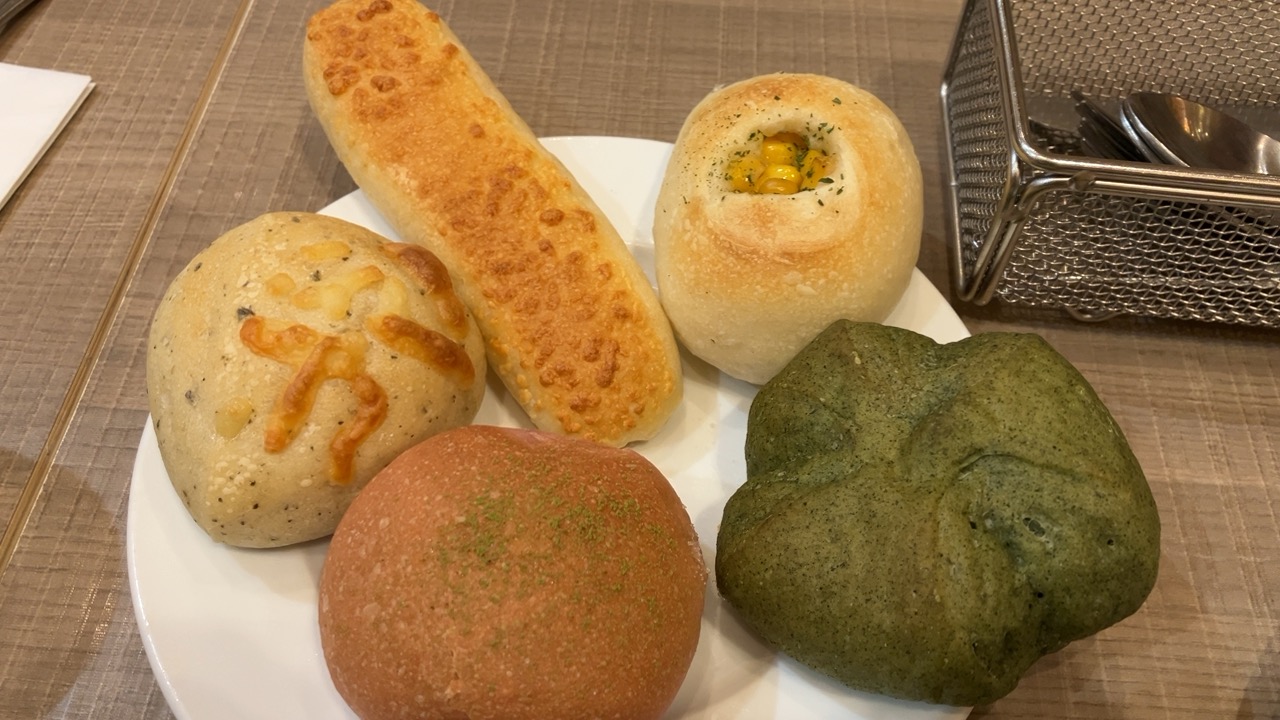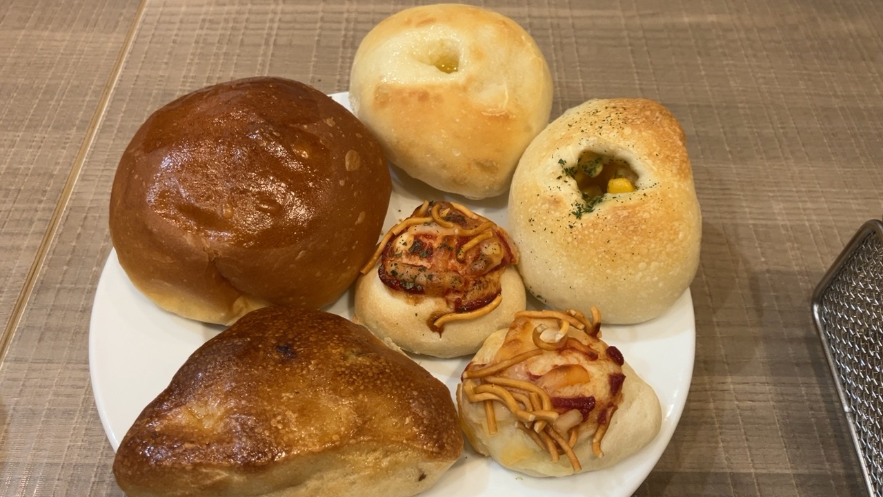 料理が作られている間にパンの食べ放題を楽しむことにします。自分でバイキングコーナーからパンを選んで持ってくる方式です。パンは小さめなので、色々な種類のパンを食べることができます。こちらが1回目です。