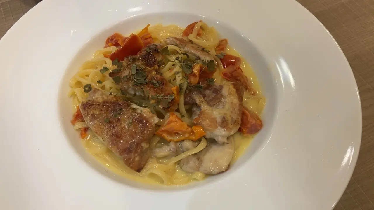 確かにグリルチキンがたっぷりパスタの上にのっています。パスタの茹で具合もちょうど良いです。