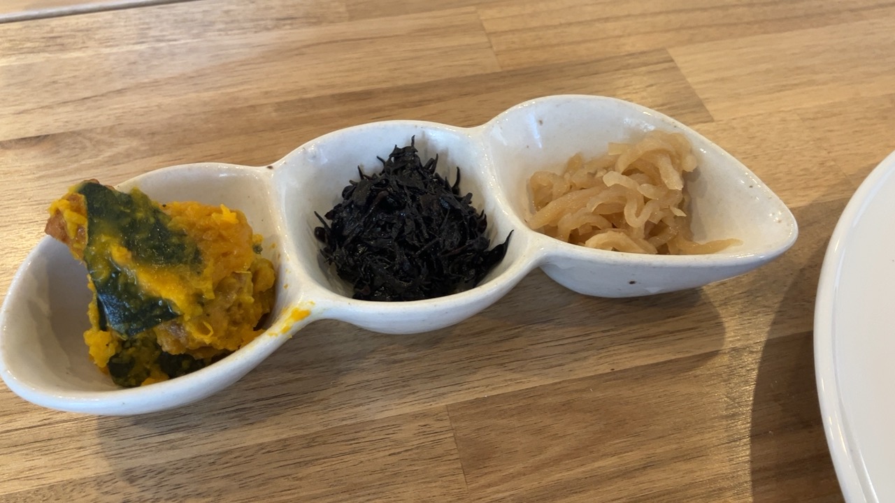 こちらは小皿、カボチャの煮物とひじき煮です。
