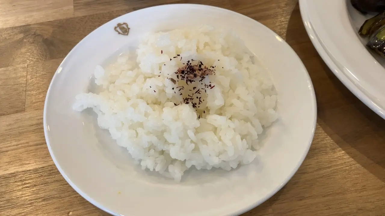 ご飯は洋食屋さんの雰囲気で平たいお皿に盛り付けられています。ご飯の上にはユカリが振りかけられています。