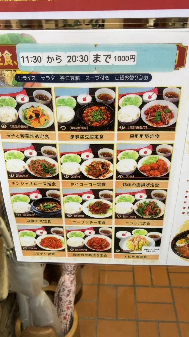 こちらは午前11時30分から午後8時までずっと頼める定食です。メジャーな中華料理が揃っています。