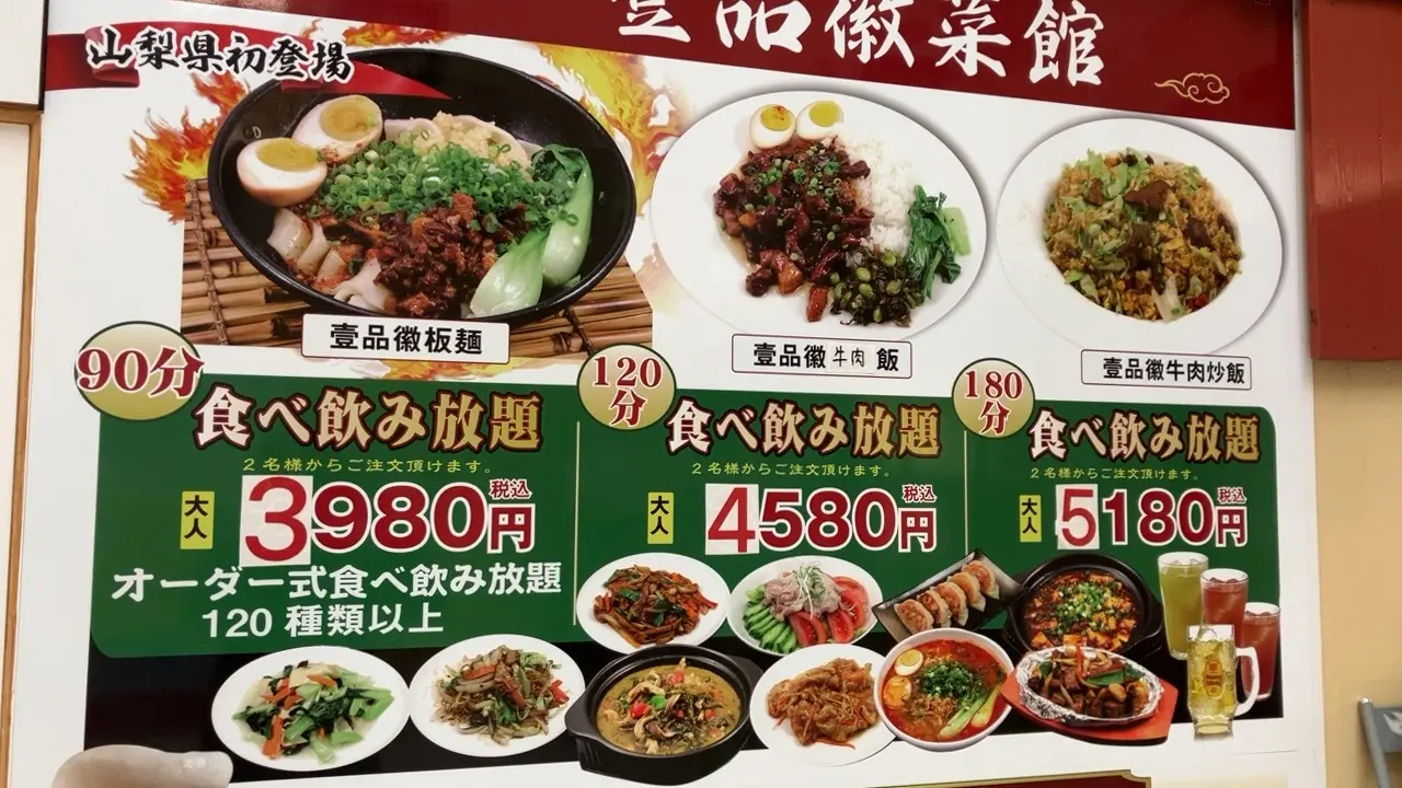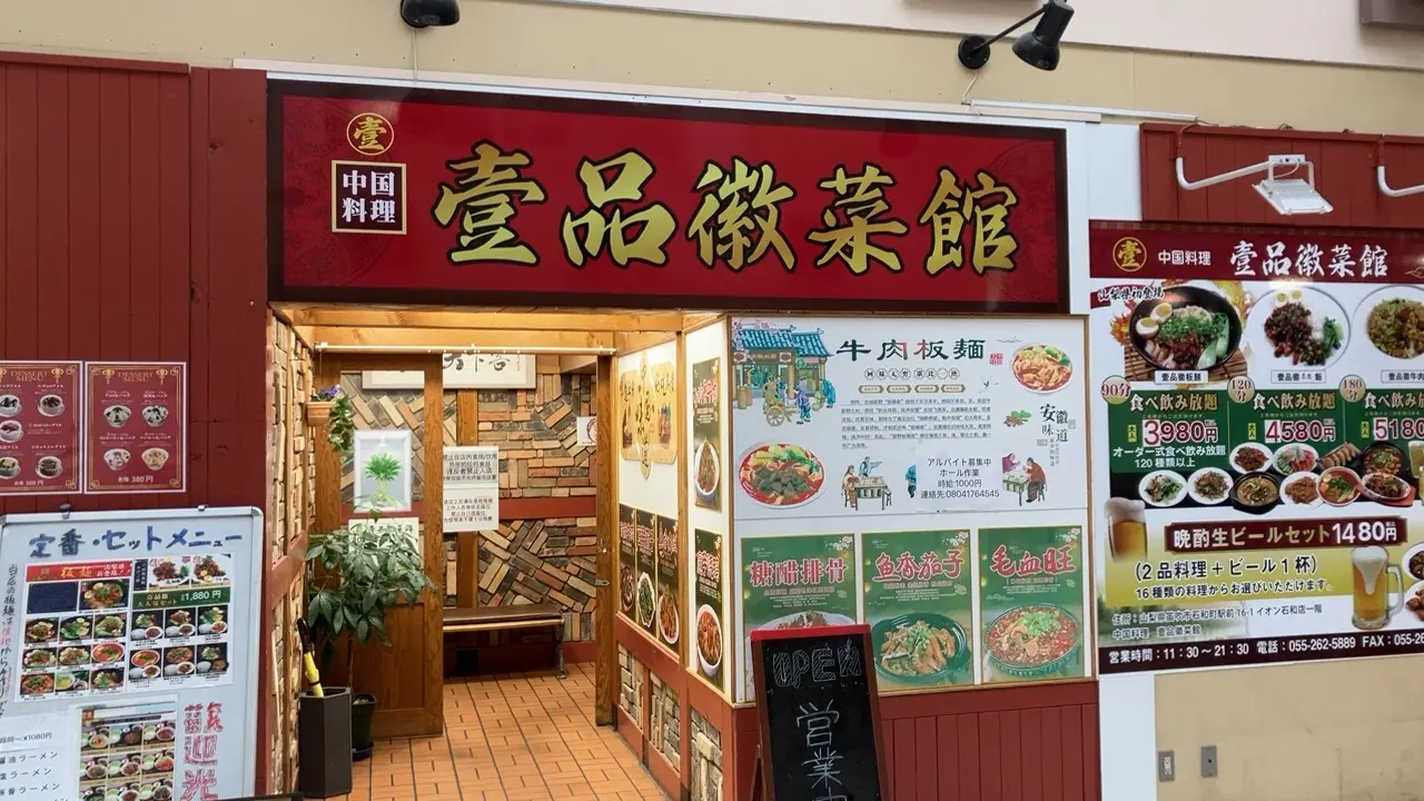 イオンは1階にドラッグストア的な品ぞろえやゲームコーナー、スーパーマーケット、パワーストーンの販売店、中華料理店、喫茶・軽食、ロッテリアなどがあります。2階にはセリア、写真館や衣類などがあります。一通り、イオンの中を探検したあと、1階の中華料理店「壹品徽菜館(いっぴんきさいかん)」に行ってみることにしました。ランチからディナータイムまで通し営業になっています。こちらのお店は2024年7月1日にオープン、それまでは別の中華料理店が入っていました。