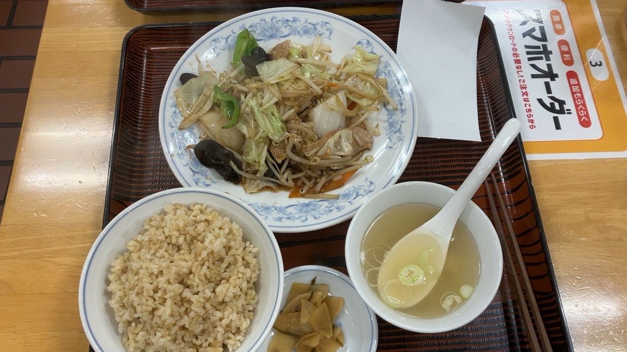 今回は美保野ポークの肉野菜炒め(610円)と玄米スープ付きライス(280円)を注文しました。こちらになります。