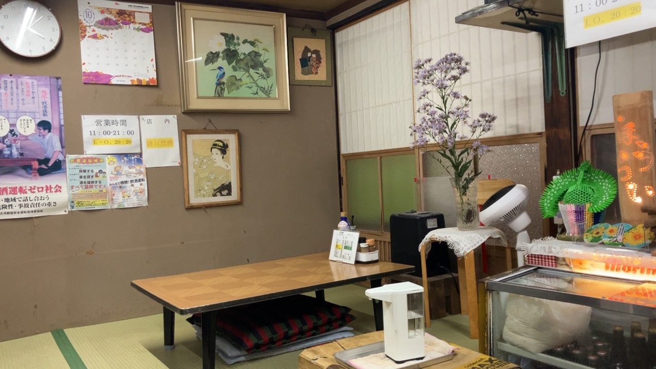店内は座敷に4人がけのテーブル席が2つ、土間に4人がけのテーブル席が2つという構成です。