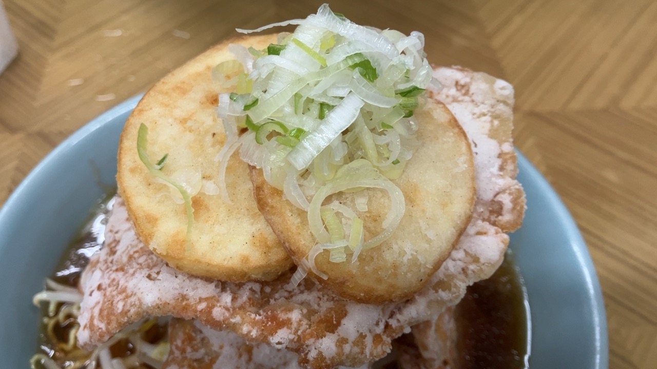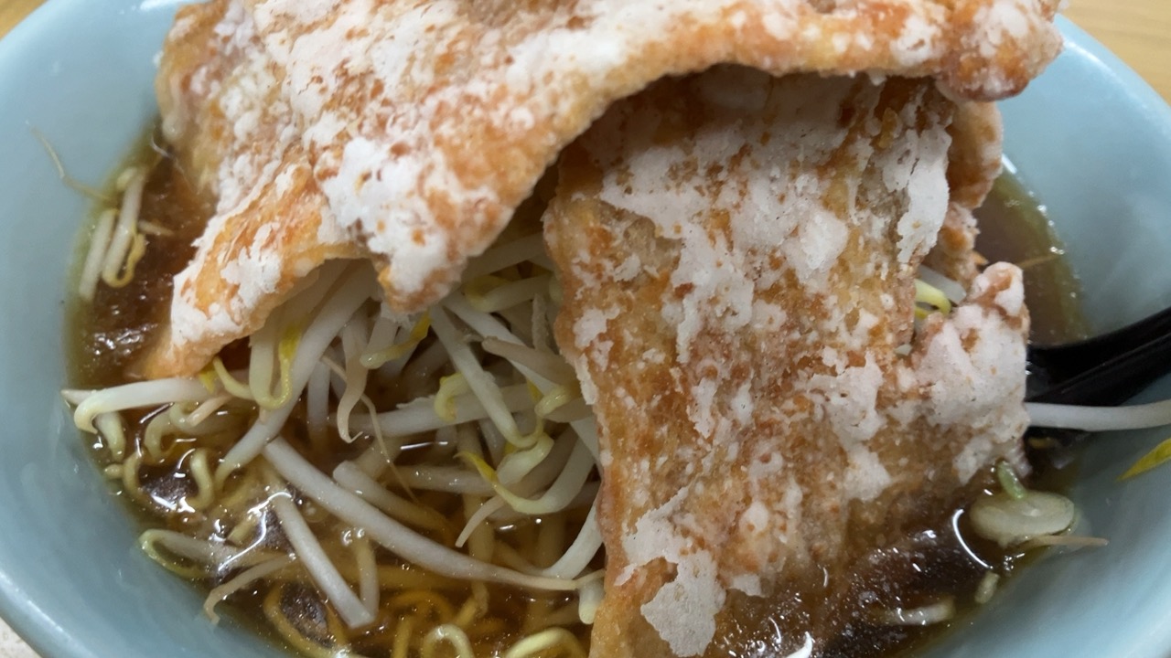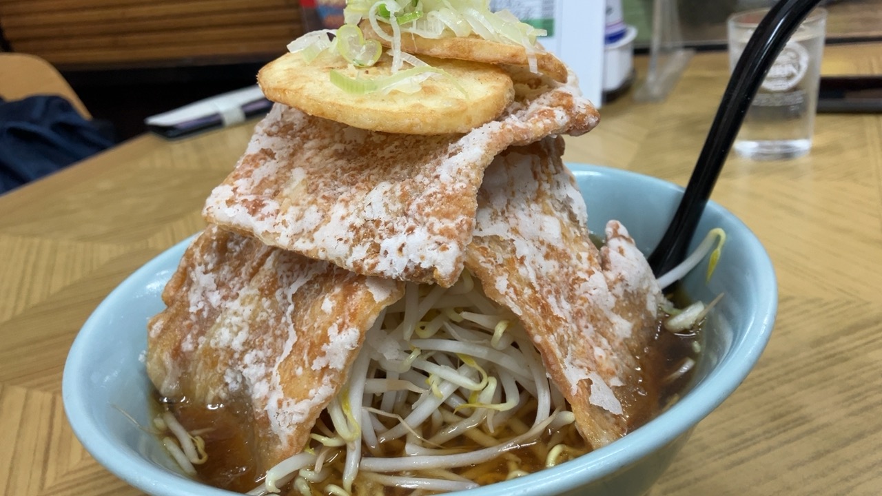 ところが横から見ると、かなりのインパクトがある写真に変貌します。麺の上には大量のモヤシ、その上には肉揚げが積み重ねられていて、その上には芋揚げがのせられています。ジェンガのイメージでしょうか。