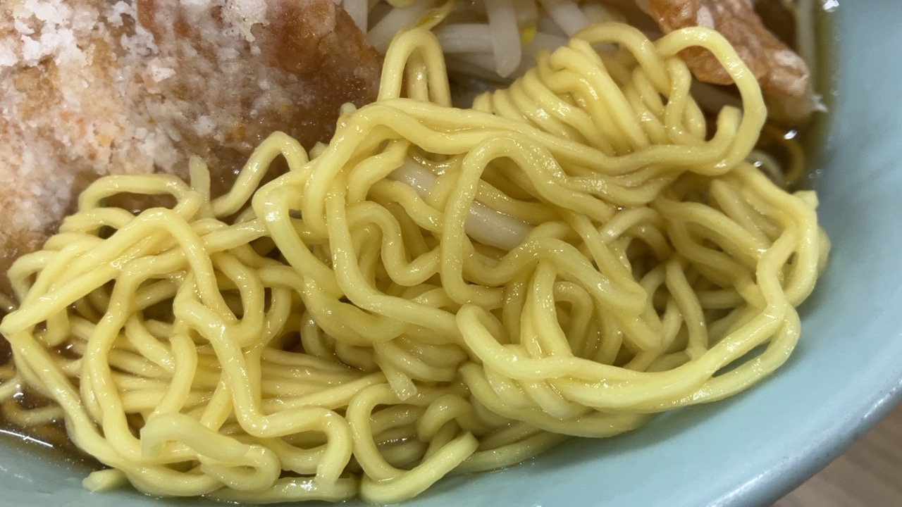 麺を引っ張り出してみました。細麺で、スープがよくなじみます。スープはあっさりとしたしょうゆ味です。
