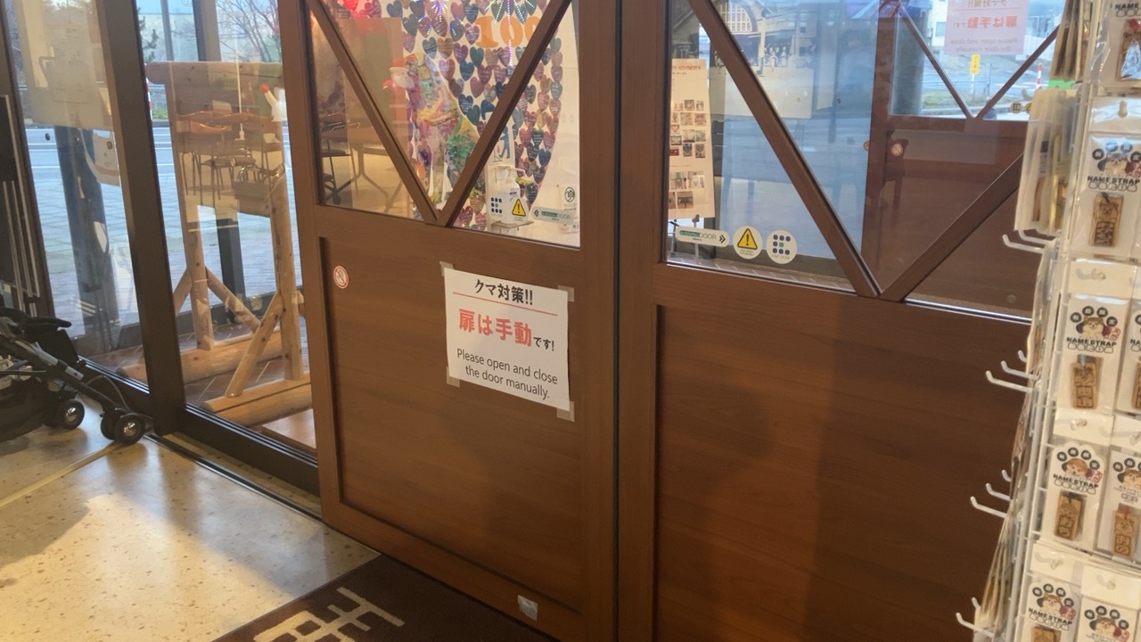 施設に入る扉には、クマ対策として扉を必ず閉めるように注意書きがありました。自動扉ではなくクマには開けにくい引き戸になっていることもポイントです。