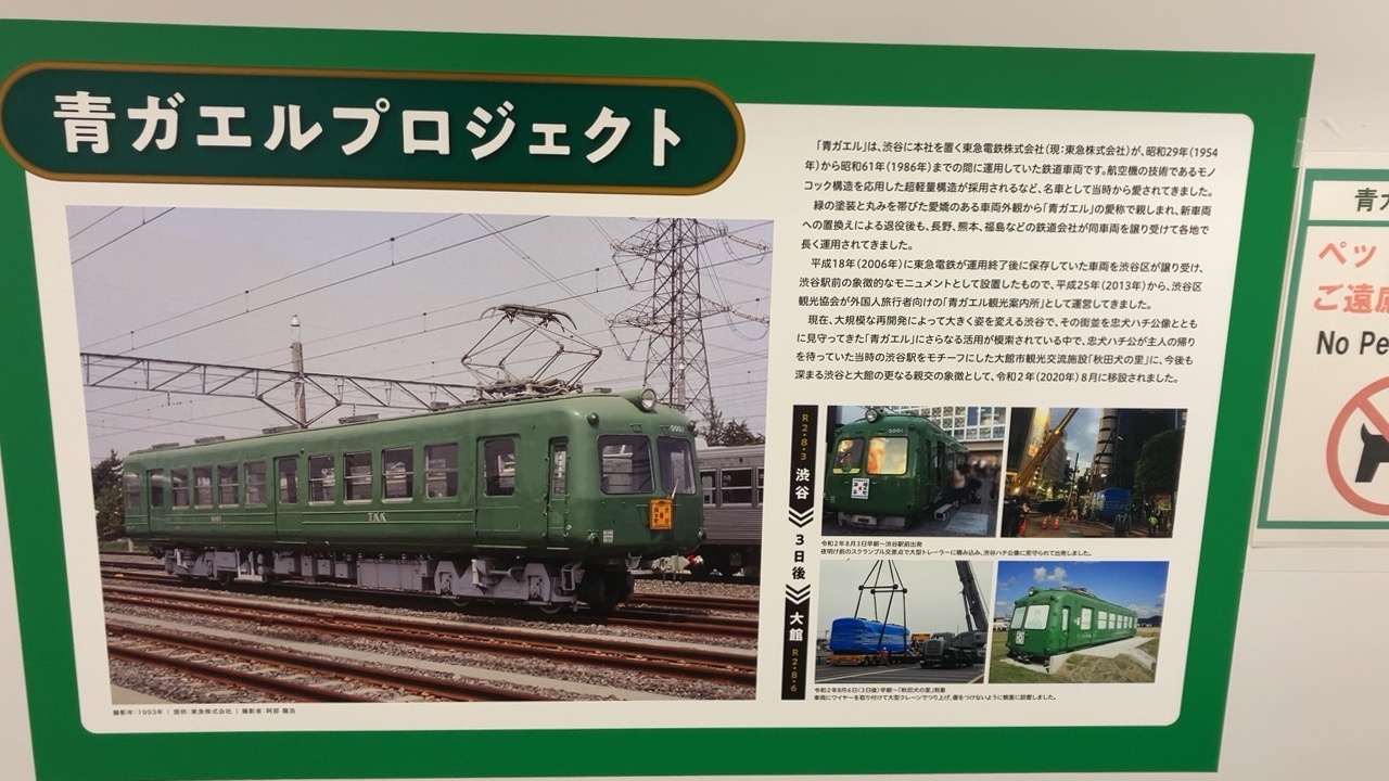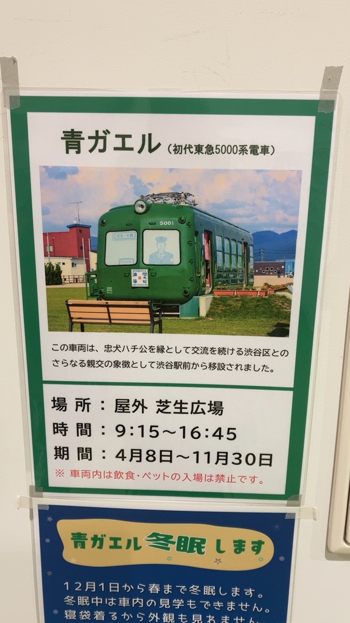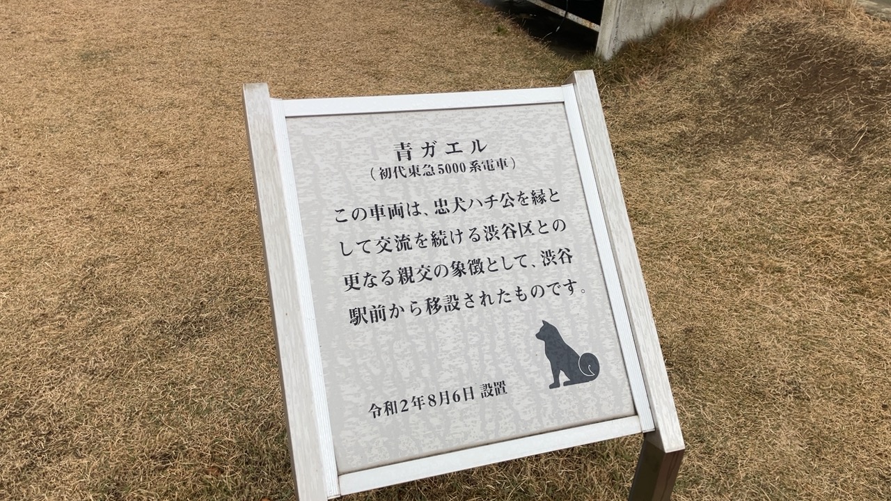 こちらの施設では、秋田犬を見るという目的とともに、2020年までは渋谷駅前のハチ公像近くに展示されていた東急電鉄の5000系電車(通称は青ガエル)が移設、展示されているというので、こちらも見てみることにします。
