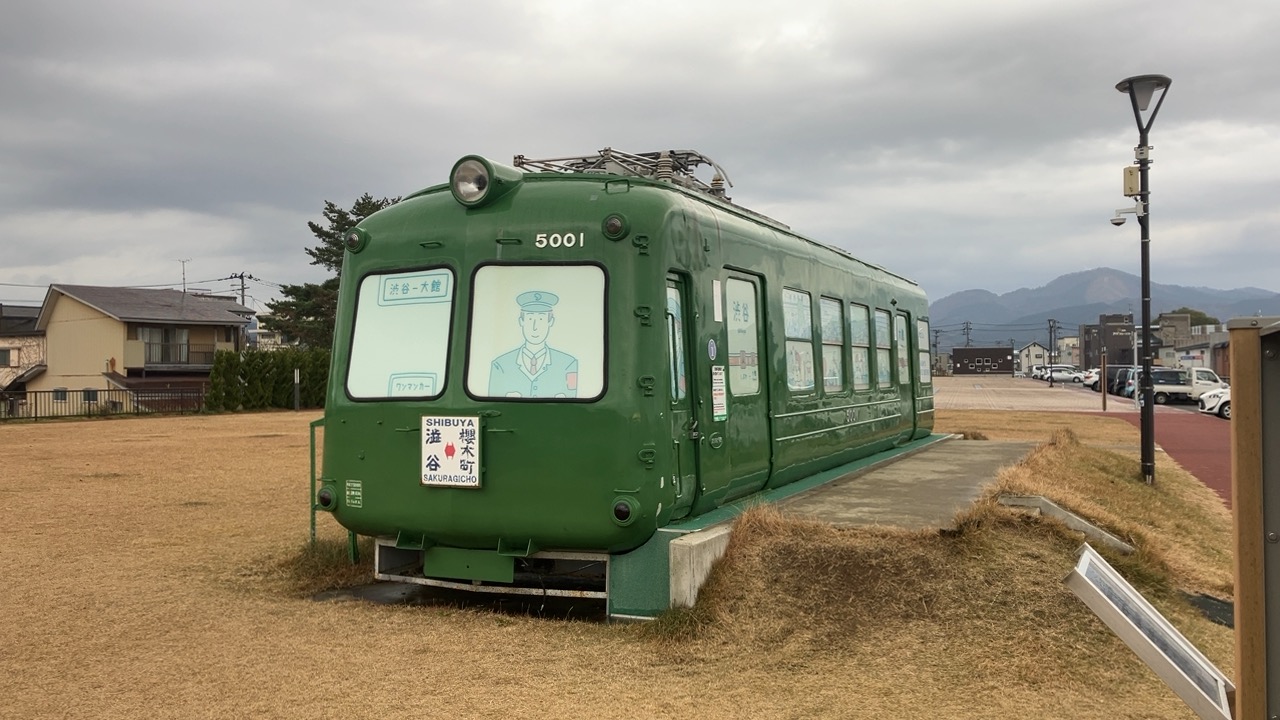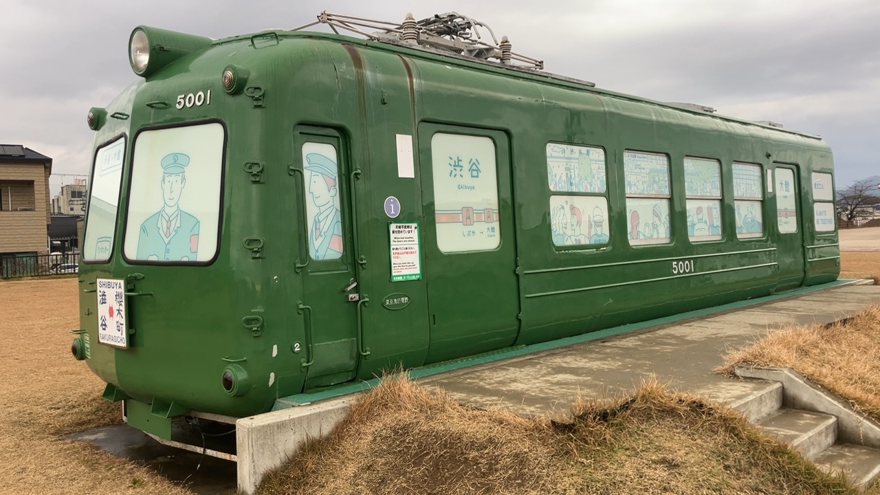 この車両は忠犬ハチ公を縁として交流を続ける渋谷区との更なる親交の象徴として渋谷駅前から移設されたものです。
