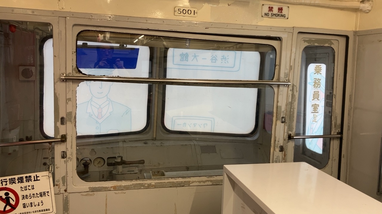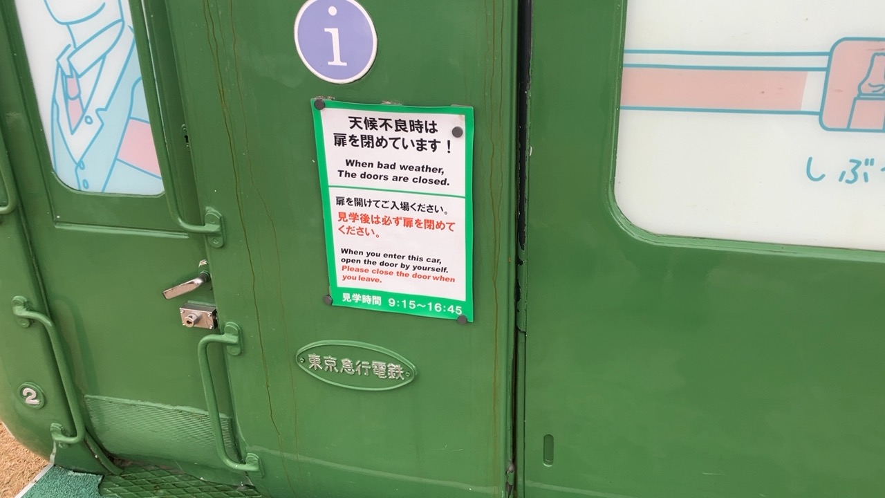 しかし、渋谷駅周辺の大規模な再開発に伴い2020年8月にこちらへ移設されました。なんとなく寸詰まりに見えますが、それもそのはずで、本当はこれよりもほぼ倍の長さがあります。半分で切断されています。乗降口も本当は3つあります。渋谷駅前に展示されるときに展示スペースのサイズに合わせてカットされました。台車や床下機器も外されています。