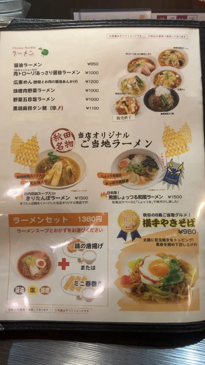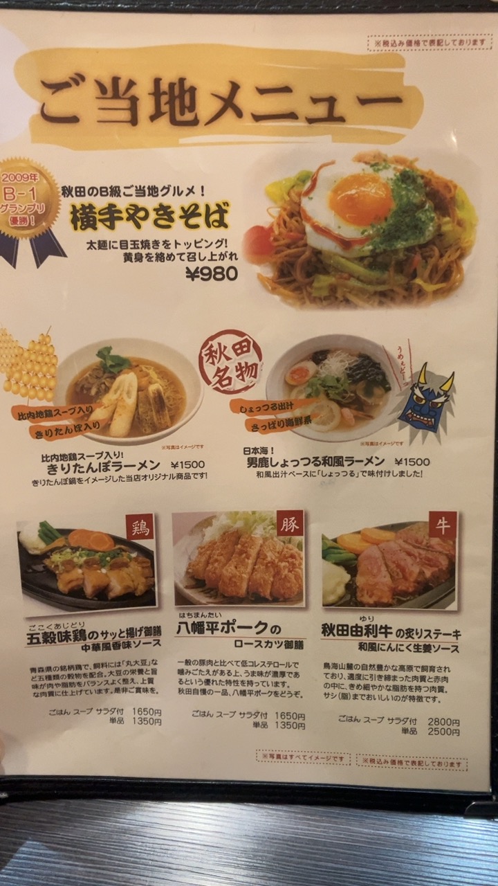 横手やきそば、比内地鶏スープ入りのきりたんぽラーメン、日本海!男鹿しょっつる和風ラーメン、五穀味鶏のサッと揚げ御膳、八幡平ポークのロースカツ御膳、秋田由利牛の炙りステーキといった食欲をそそるメニューが並んでいます。