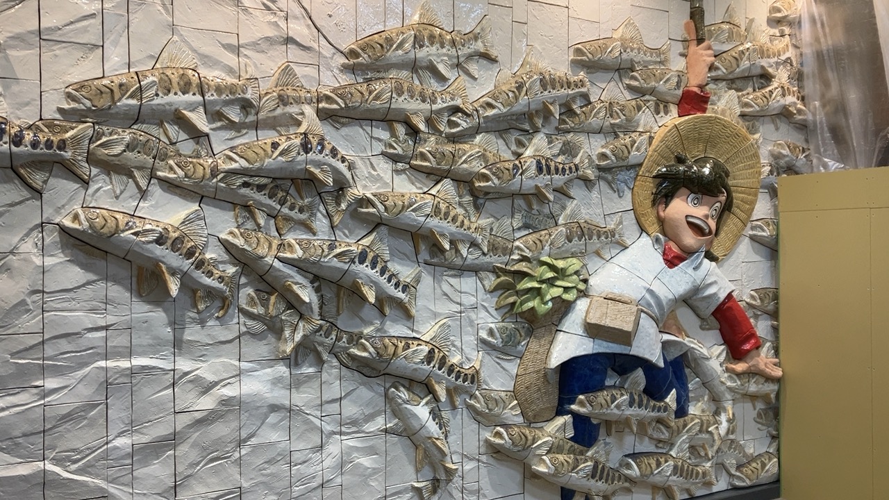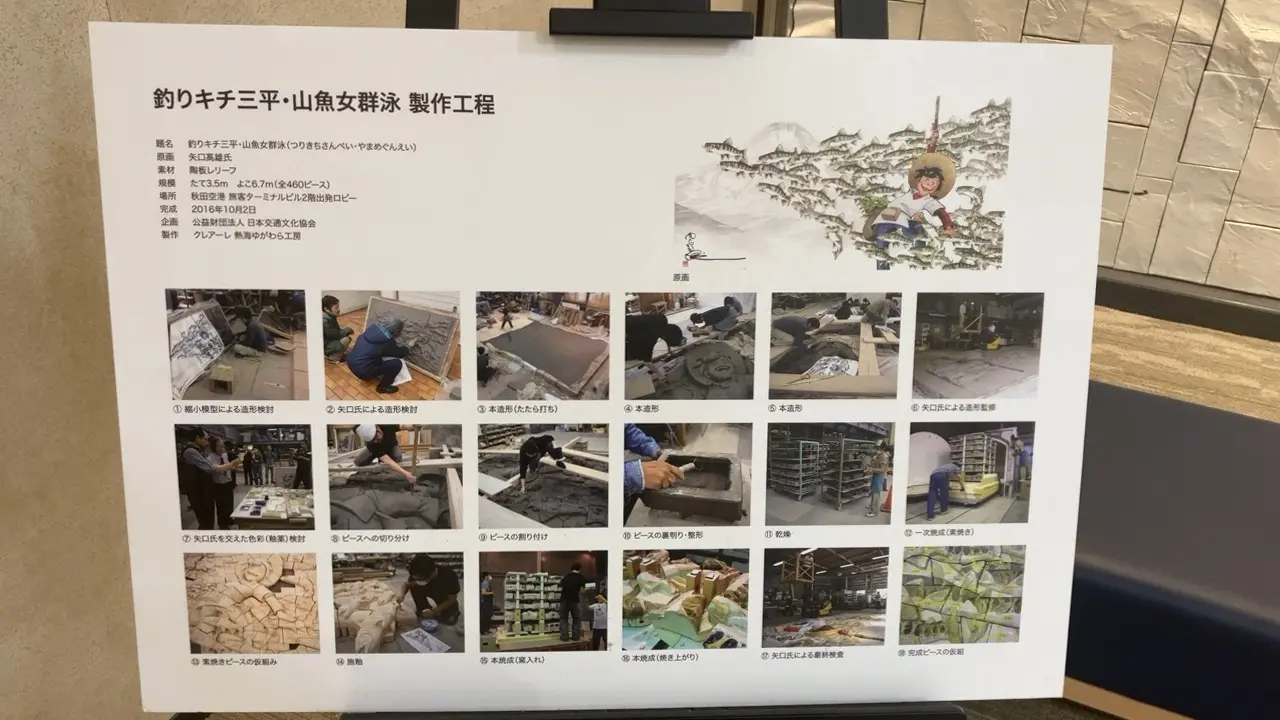 なぜか、空港内の壁面に釣りキチ三平が生き生きと刻まれていました。