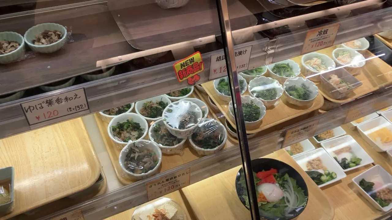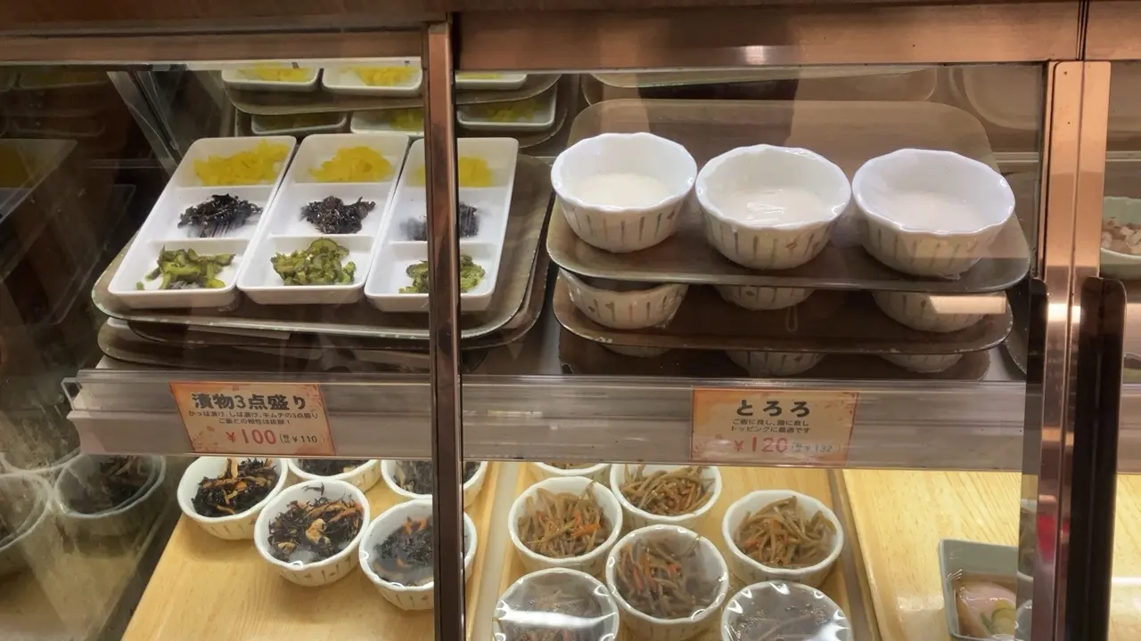 ショーケースの中には漬物、とろろ、納豆などのご飯のお供が並んでいます。