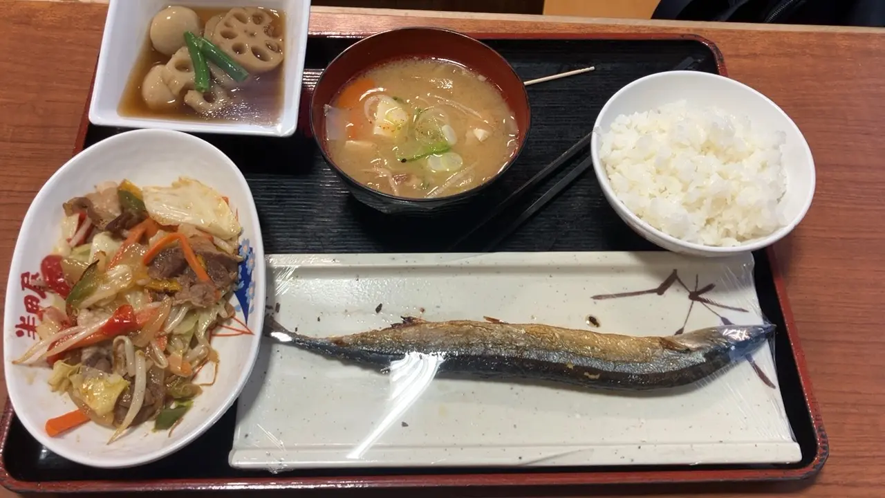こちらは、筑前煮、豚汁、野菜炒め、秋刀魚、ライスの組み合わせです。