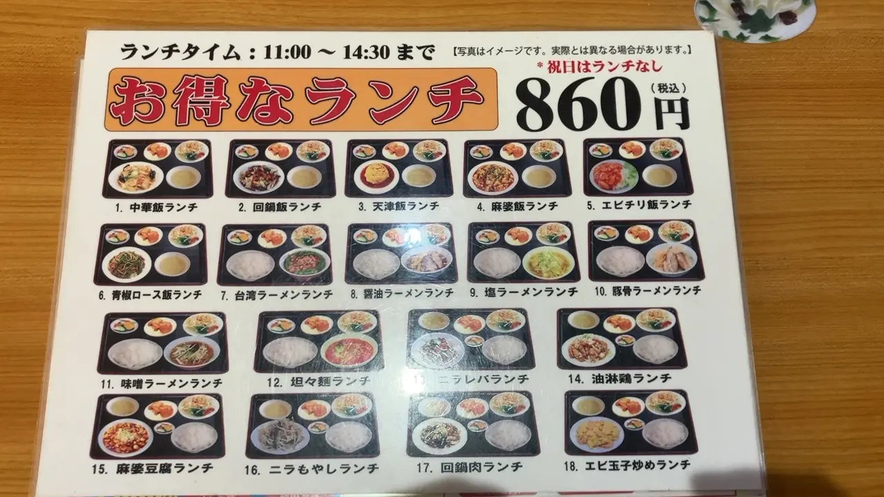 こちらは豊富なメニューから選ぶことができるお得なランチです。「祝日はランチなし」と書かれています。