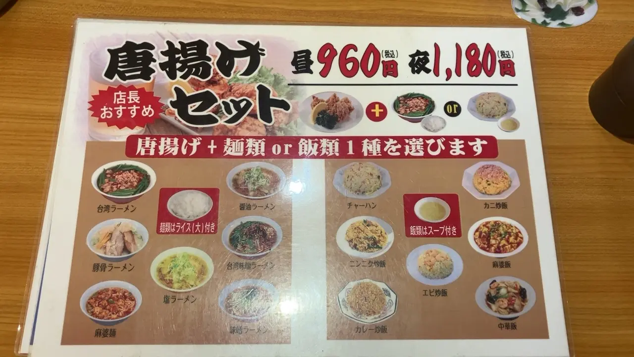 こちらは唐揚げセットです。昼と夜で値段が違います。