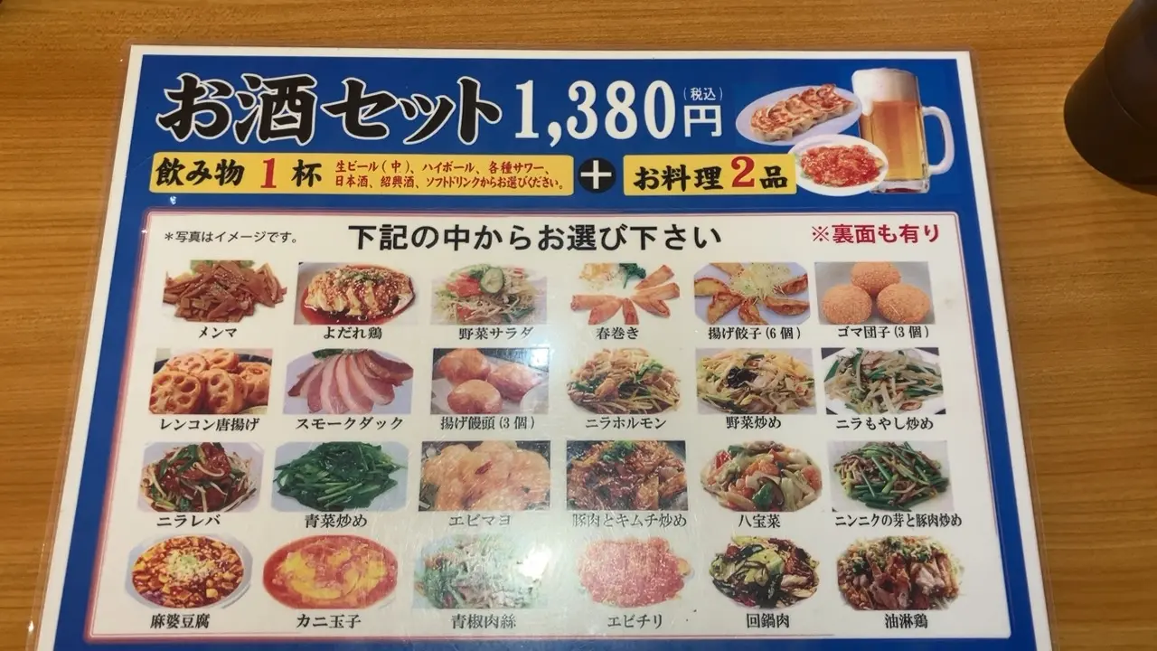 こちらはお酒セットです。飲み物一杯と料理を2品選ぶことができます。