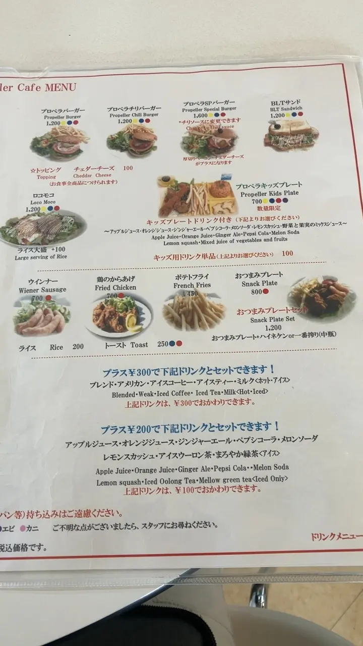 こちらがプロペラカフェのメニューです。プロペラバーガー(1200円)は看板メニューとなっているようで、注文している人が多かったです。