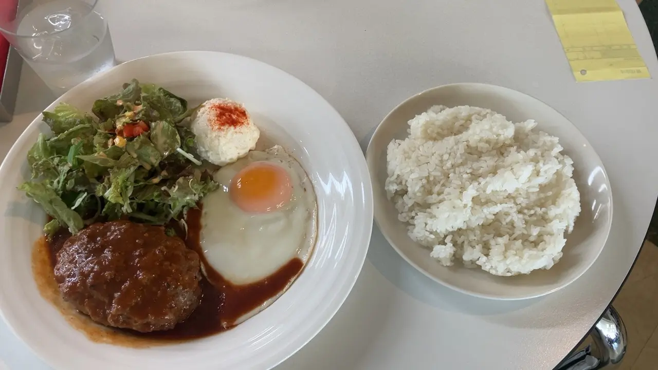 今回はハンバーグステーキを注文しました。ご飯かトーストが選べますが、ご飯を付けてもらいました。