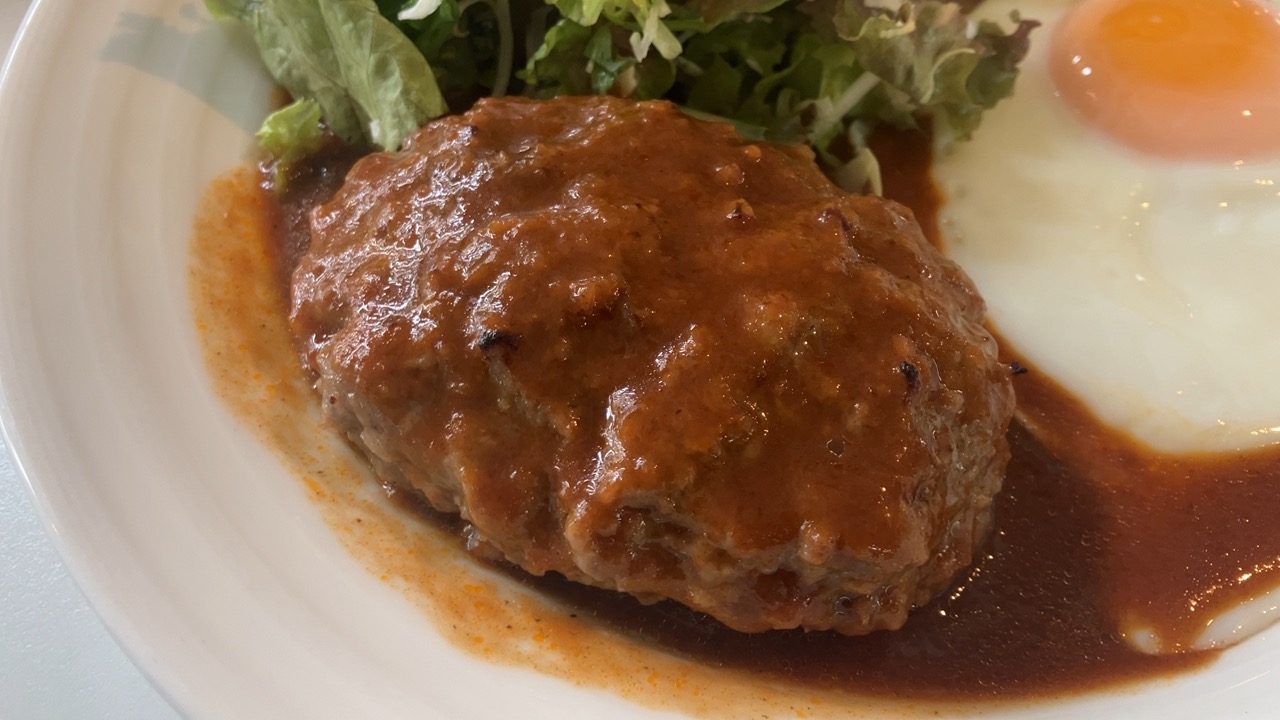 ハンバーグは厚みのあるタイプです。ひき肉が大きめで少しお肉の歯触りを感じられます。美味しいハンバーグです。