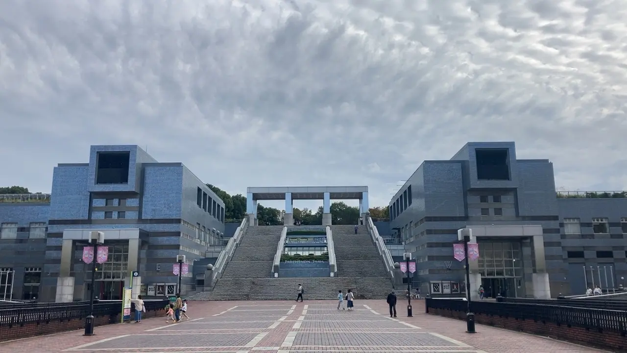 このパルテノン多摩の向こう側が多摩中央公園になります。この長い階段を上っても良いのですが、大変そうなので、パルテノン多摩の建物の中にあるエレベータで最上階に行き、多摩中央公園に行きました。
