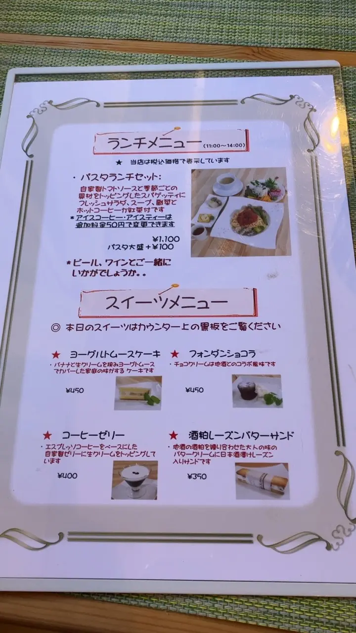 こちらがメニューになります。ランチメニューは1種類、パスタランチセットのみとなっています。自家製トマトソースと季節ごとの具材をトッピングしたスパゲティにフレッシュサラダ、スープ、副菜とホットコーヒーまたはホットティーが付きます。価格は1,100円、パスタの大盛はプラス100円です。アイスコーヒーまたはアイスティーはプラス50円です。