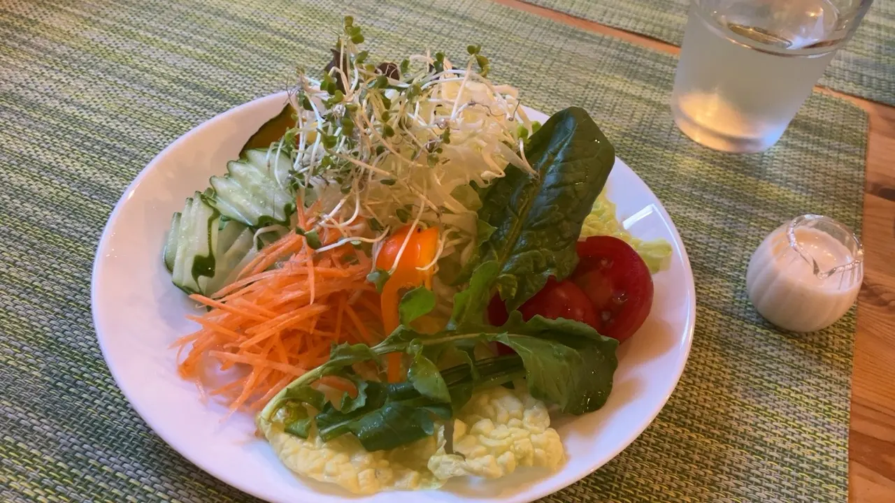 新鮮ないろいろな野菜が盛り合わされていて、付属のドレッシングをかけて食べると身体が喜びます。