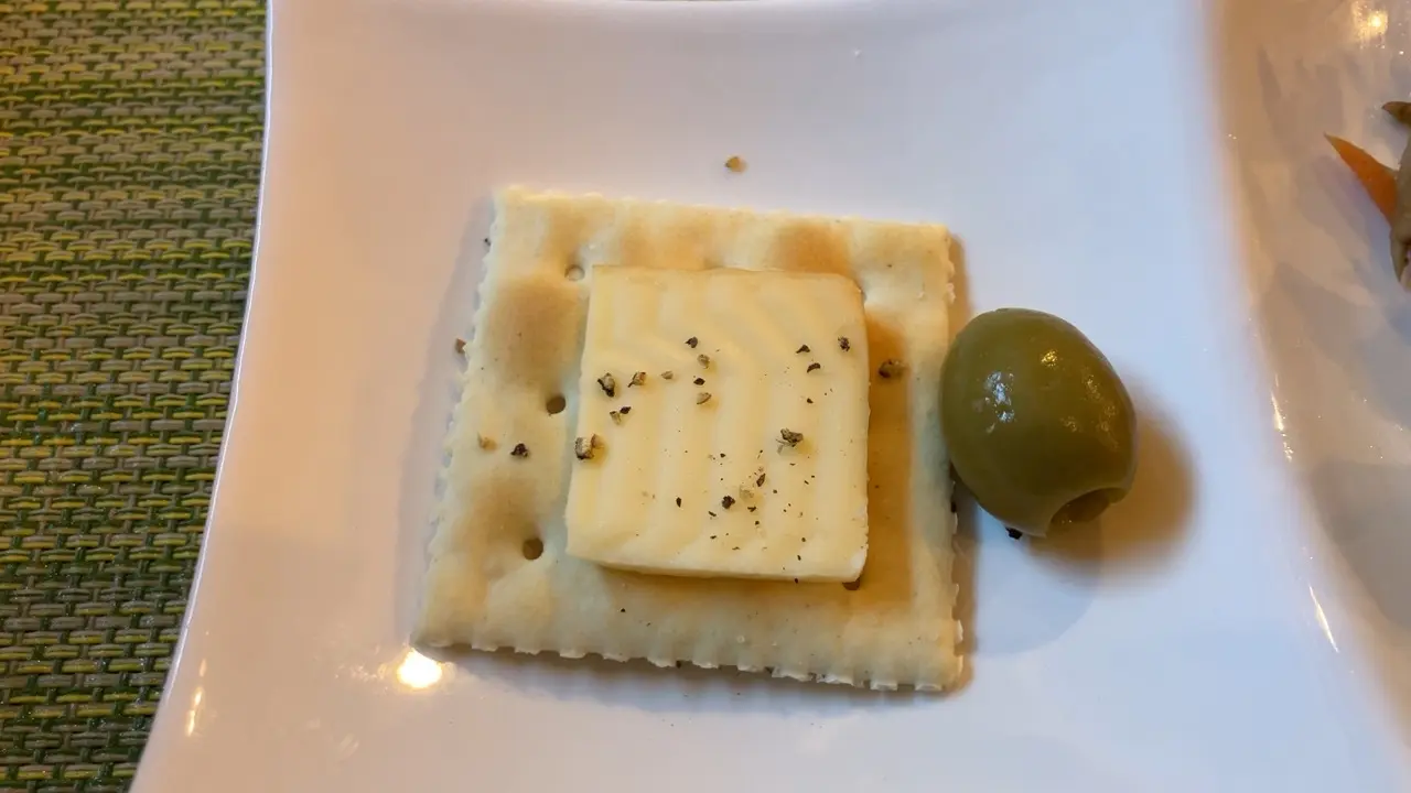 副菜はチーズを載せたクラッカーとオリーブ。