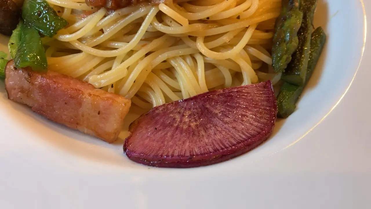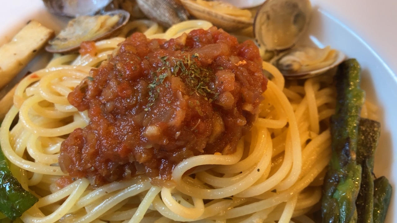 パスタの上に載っているのはトマトソースと呼べば良いのでしょうか。自家製ということで繊細な味付けです。