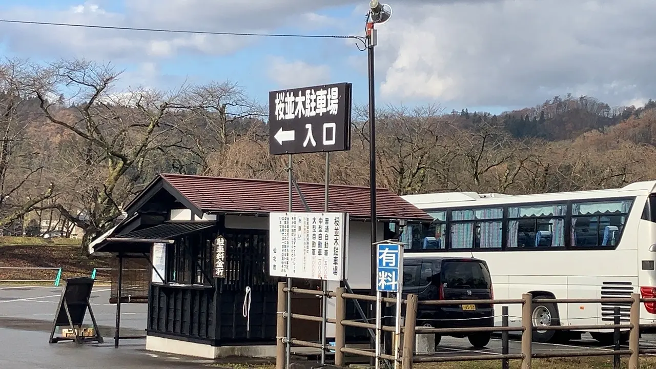 こちらが桜並木駐車場の入口です。クルマで入ると、係の人が出てきて、料金の徴収となります。