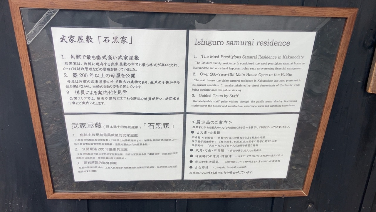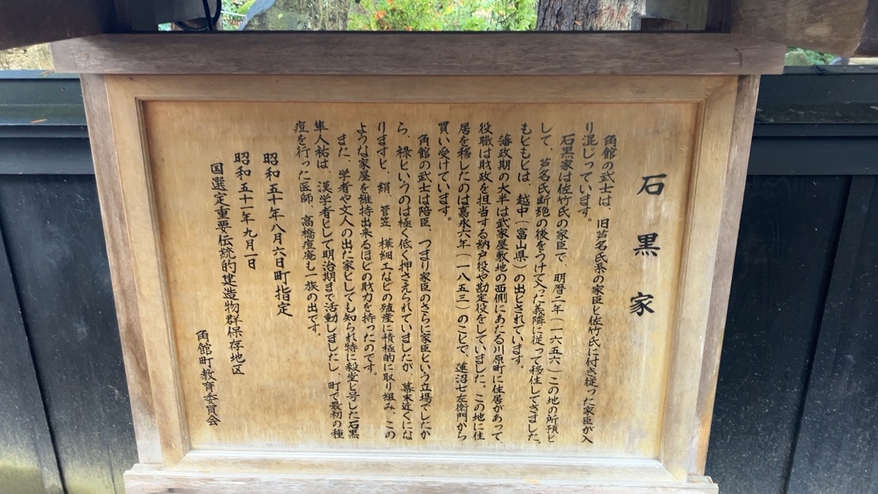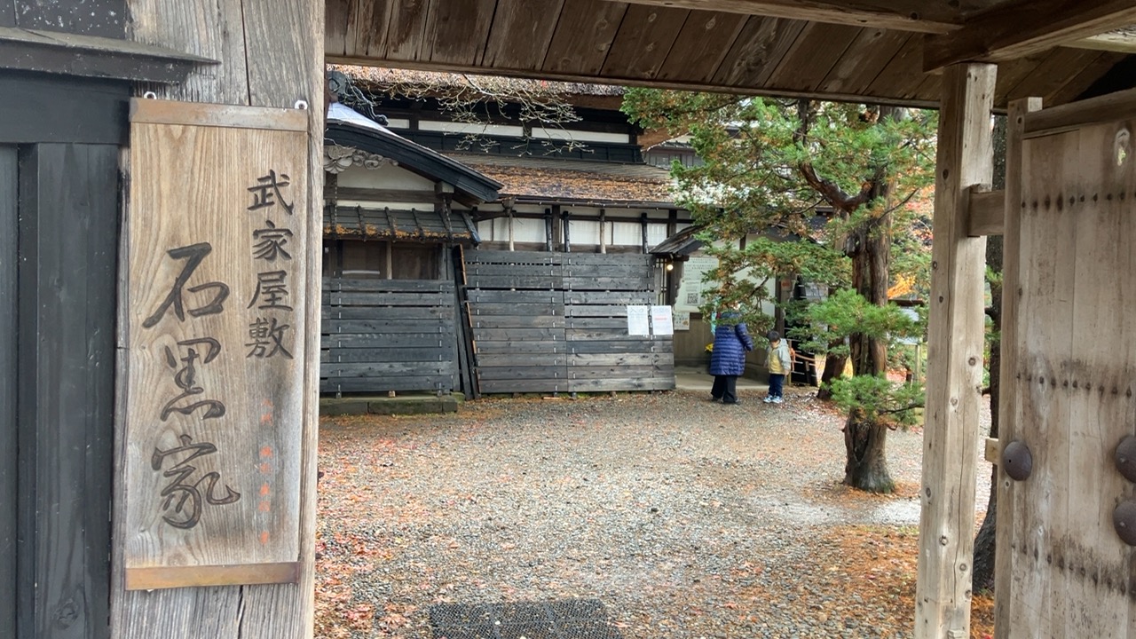 石黒家は武家屋敷通りの北端に位置しています。上級武士の格式高い屋敷で、江戸時代そのままの姿で主屋、門、塀、土蔵などが保存されています。
