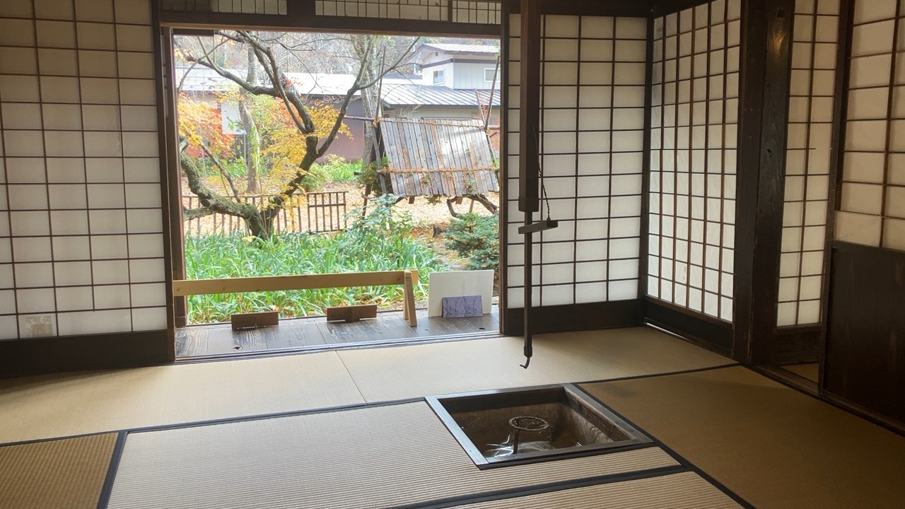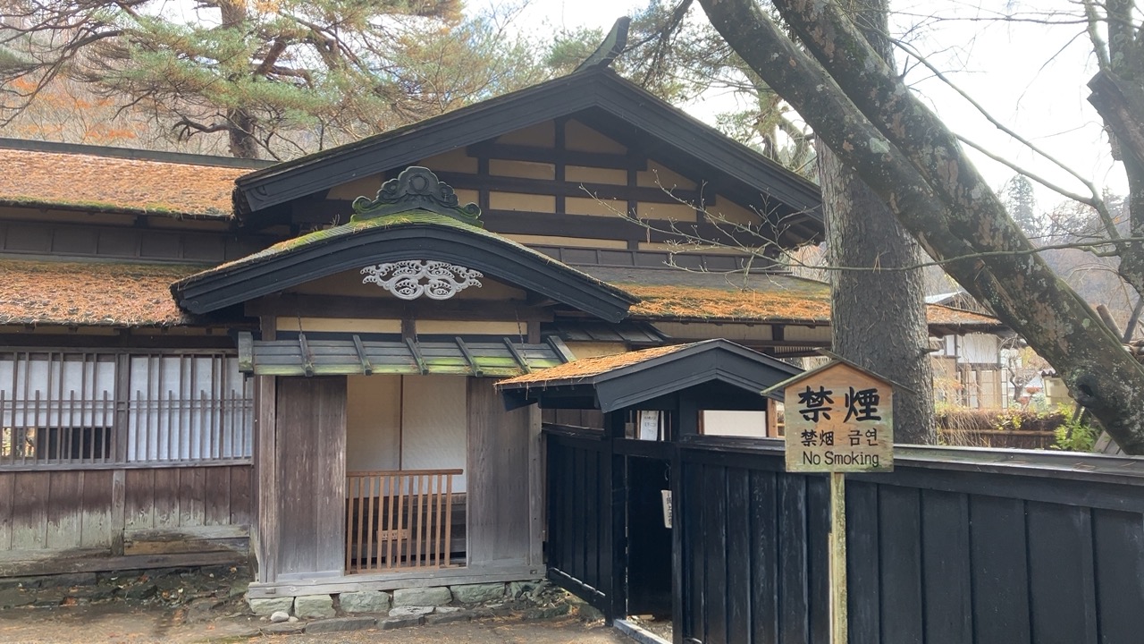 薬医門には文化六年(1809)4月27日銘の矢板があり、その古さと重厚さをしのばせています。門を入ると正玄関と脇玄関があり、二つの玄関を持つことは身分の高い武士の証でした。主屋は萱葺きで、庭には水に見立てた苔が簡素な佇まいのなかに武家の格式を漂わせています。