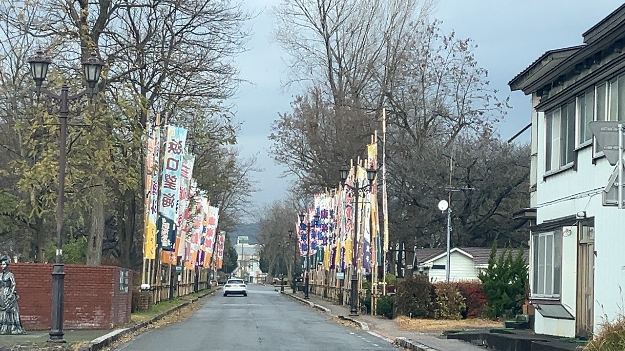 小坂鉄道レールパークを見学したあと、明治百年通りをクルマで走って、小坂鉱山事務所に向かってみました。明治百年通りは旧小坂鉄道の廃線跡に沿っている道で、道の両脇にはのぼりが立っています。